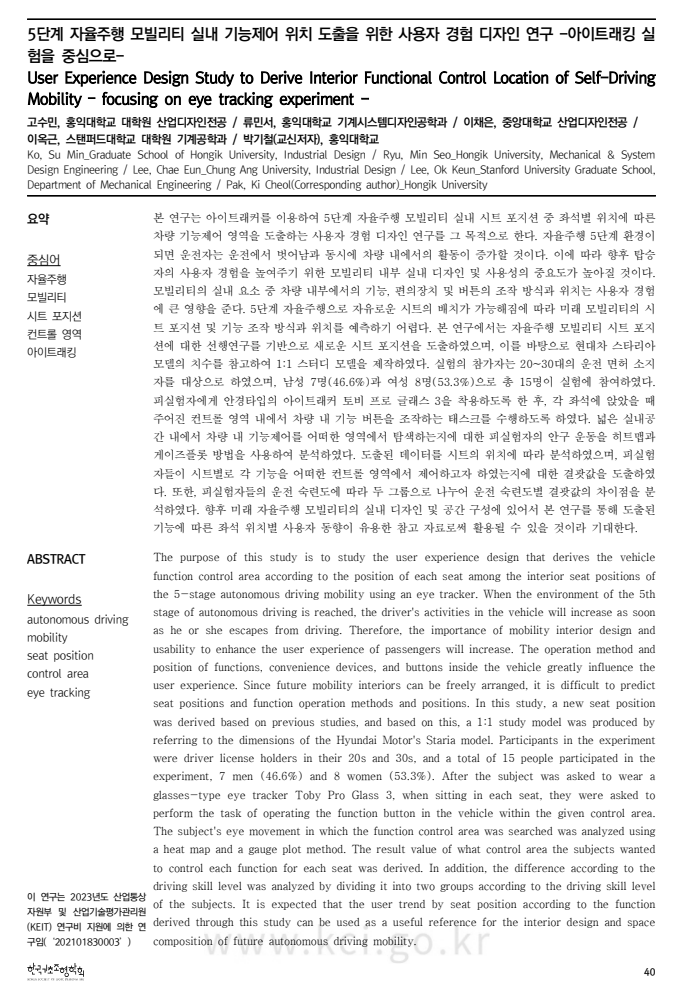 본 연구는 레벨5 완전 자율주행 모빌리티 환경에서 탑승자의 사용자 경험을 고려한 실내 기능제어 위치를 도출하기 위해 아이트래킹 실험을 활용한 디자인 연구를 수행하였다. 자율주행 기술이 고도화되면 운전자는 더 이상 직접 운전을 하지 않게 되고, 차량 내부에서 다양한 활동을 자유롭게 수행할 수 있게 된다. 이에 따라 모빌리티 내부 공간은 단순 이동 수단을 넘어 휴식, 업무, 엔터테인먼트 등 다양한 생활 활동이 이루어지는 제2의 생활 공간으로 확장될 것이며, 내부 기능과 제어 버튼의 위치는 사용자 경험에 핵심적인 요소로 작용한다. 기존의 차량은 운전석 중심으로 버튼이 집중되어 있으나, 자율주행 레벨5에서는 자유로운 시트 배치가 가능해지므로 좌석 위치에 구애받지 않는 기능제어 방식과 최적의 제어 위치에 대한 연구가 필요하다.