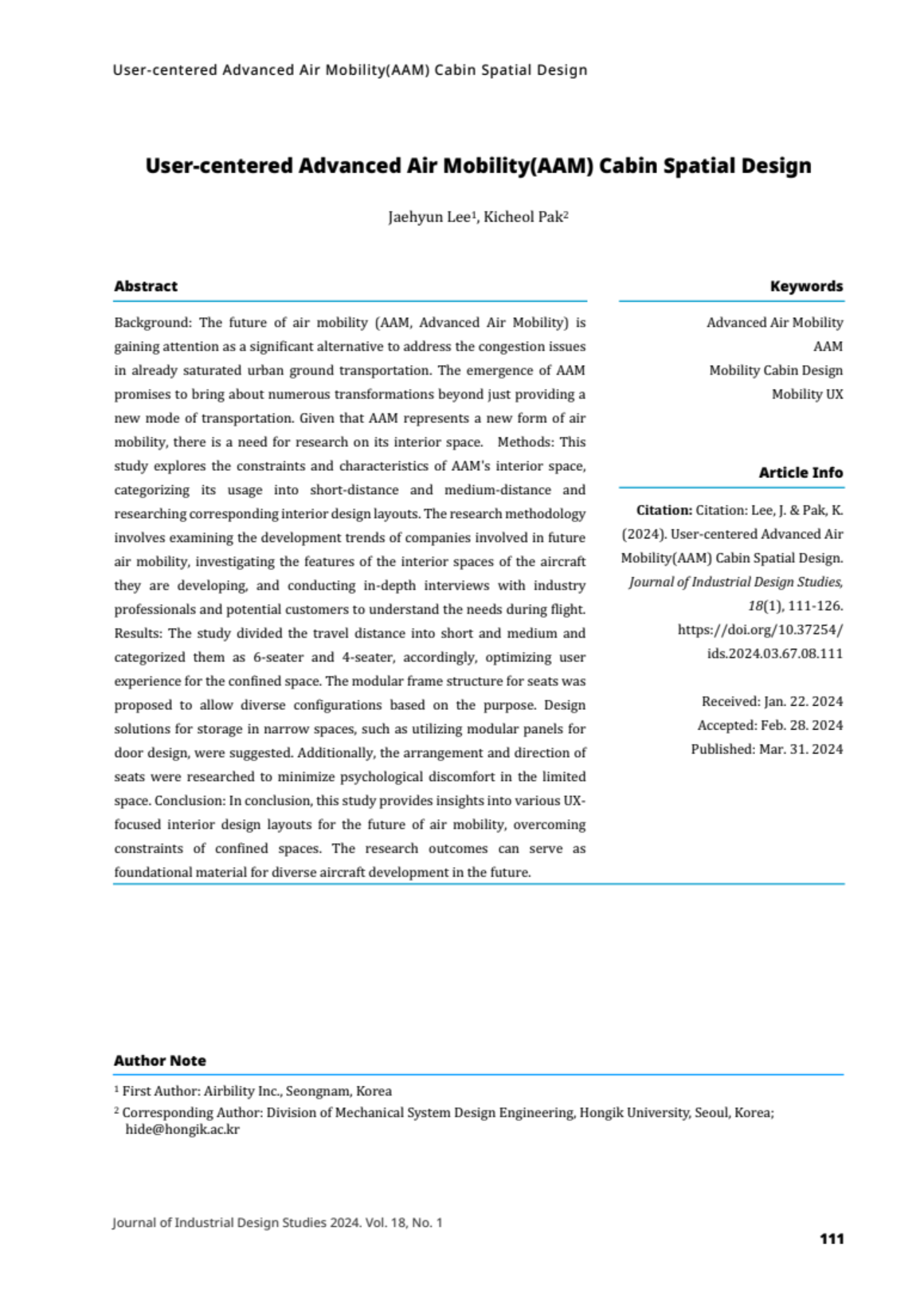 이 연구는 도심 교통 혼잡을 해결할 대안으로 주목받고 있는 미래 항공 모빌리티(AAM, Advanced Air Mobility)의 캐빈 공간 디자인을 사용자 중심 관점에서 탐구하는 것을 목적으로 한다. AAM은 단순히 새로운 교통수단을 제공하는 것을 넘어, 도시 내 이동과 도시 간 연결을 포함한 다양한 영역에서 혁신적 변화를 촉발할 잠재력을 지니고 있다. 특히 eVTOL(electric Vertical Take-Off and Landing) 기반 기체의 개발이 가속화되면서 좁은 기내 공간에서 사용자 경험을 최적화하는 디자인 연구의 필요성이 대두되고 있다. 본 연구는 선행 문헌 검토, 기업 동향 조사, 실제 항공 산업 종사자 및 잠재 사용자와의 심층 인터뷰를 통해 AAM 캐빈 공간의 제약과 가능성을 규명하고, 사용자 경험을 반영한 디자인 레이아웃을 제안한다.