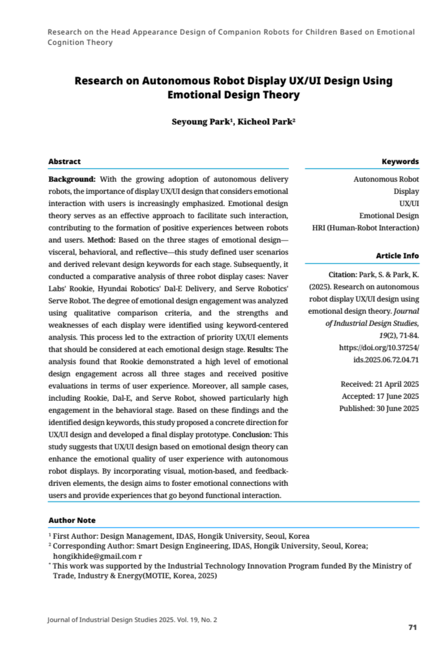 본 연구는 자율주행 배송 로봇의 확산에 따라 로봇과 사용자 간 상호작용을 매개하는 디스플레이의 UX/UI 디자인이 단순한 정보 전달을 넘어 사용자의 감성적 경험을 형성하는 핵심 요소임을 전제로 시작되었다. 기존의 로봇 연구는 기술 중심적 접근이 주를 이루었으나, 사용자가 로봇을 친근하고 신뢰할 수 있는 대상으로 인식하게 하기 위해서는 감성디자인 이론을 적용한 UX/UI 설계가 필요하다. 이에 본 연구는 Donald Norman이 제시한 감성디자인의 세 단계, 즉 본능적(Visceral), 행위적(Behavioral), 성찰적(Reflective) 단계에 따라 사용자 경험을 분석하고 자율주행 로봇 디스플레이 설계 방향을 제안하는 것을 목적으로 한다.
