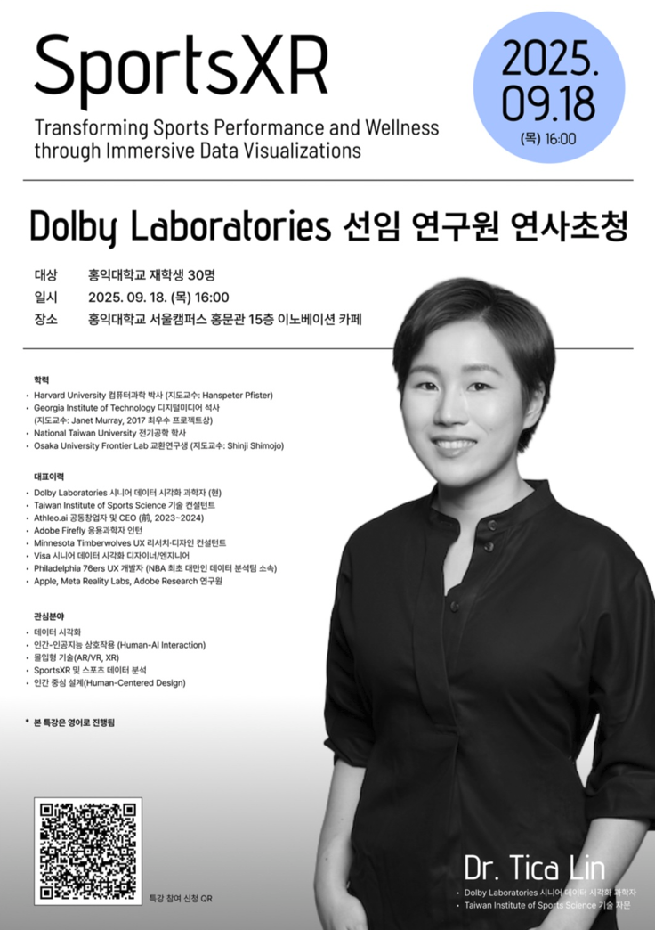 2025년 9월 18일(목) 오후 4시, Dolby Laboratories의 Dr. Tica Lin을 초청하여 SportsXR: Transforming Sports Performance and Wellness through Immersive Data Visualizations를 주제로 특강을 진행합니다. 이번 강연은 데이터 시각화, 스포츠 XR, 인간-기계 상호작용 등 융합적 연구 분야에 관심 있는 학생들에게 소중한 배움의 기회가 될 것입니다.