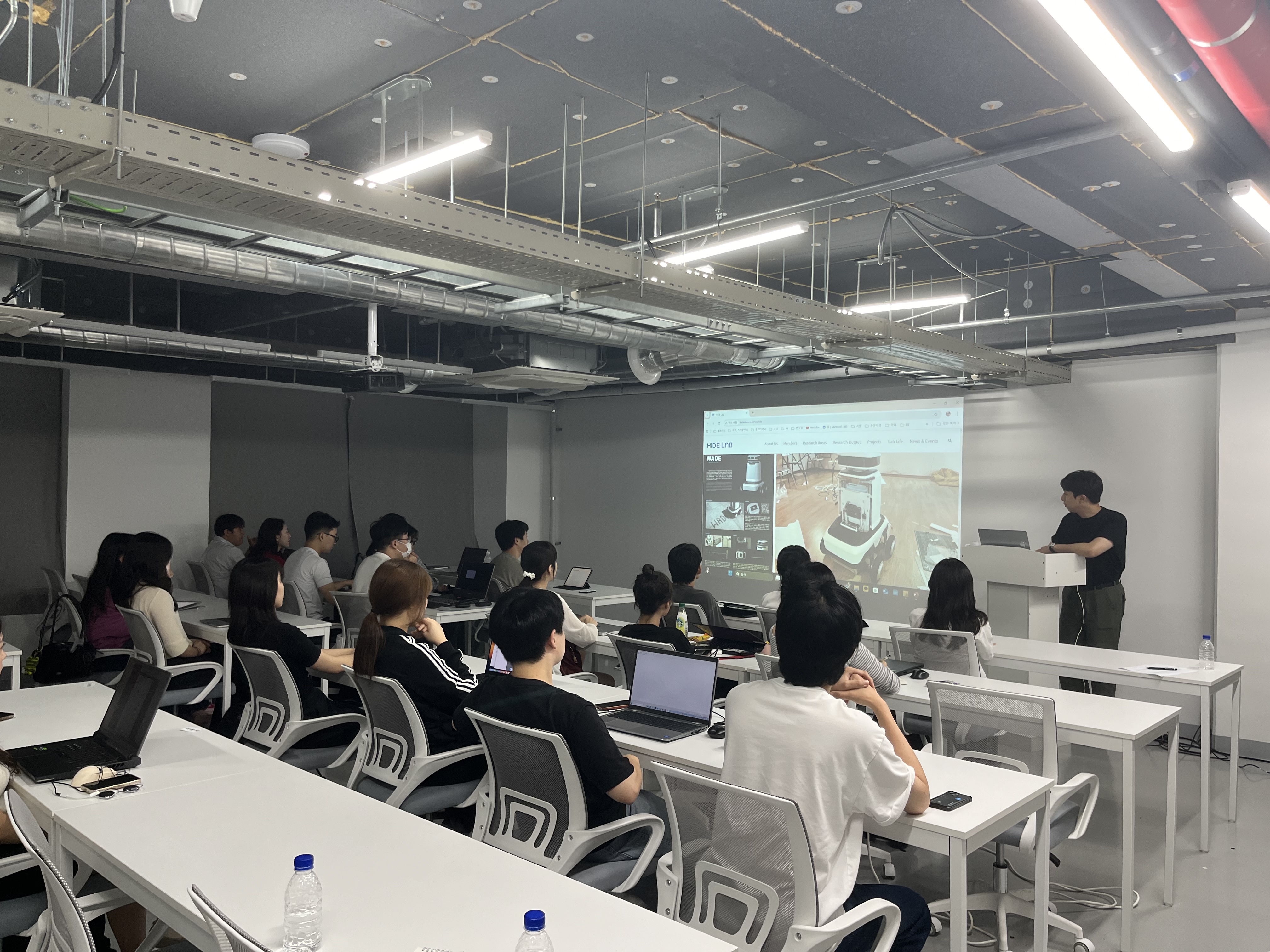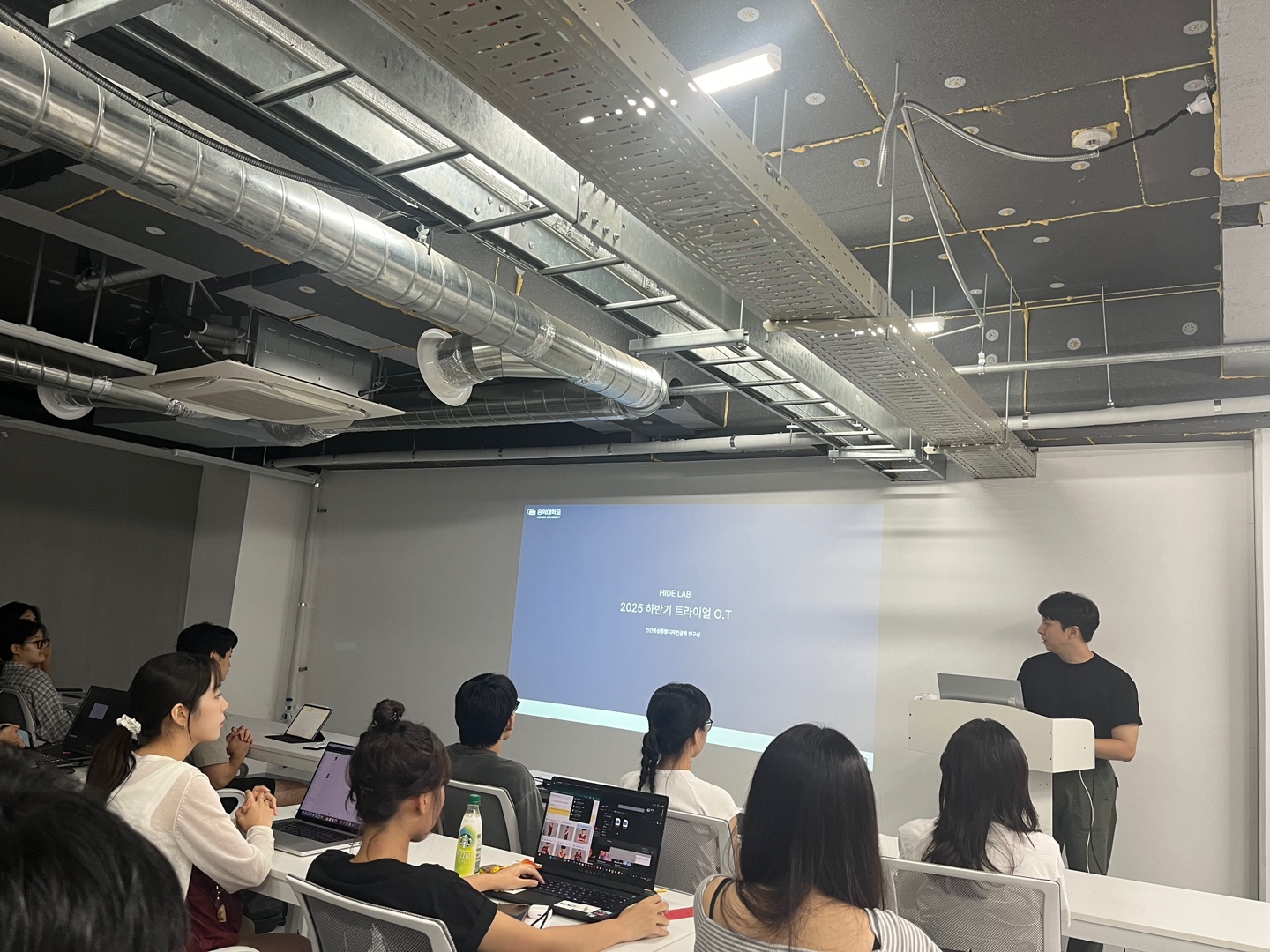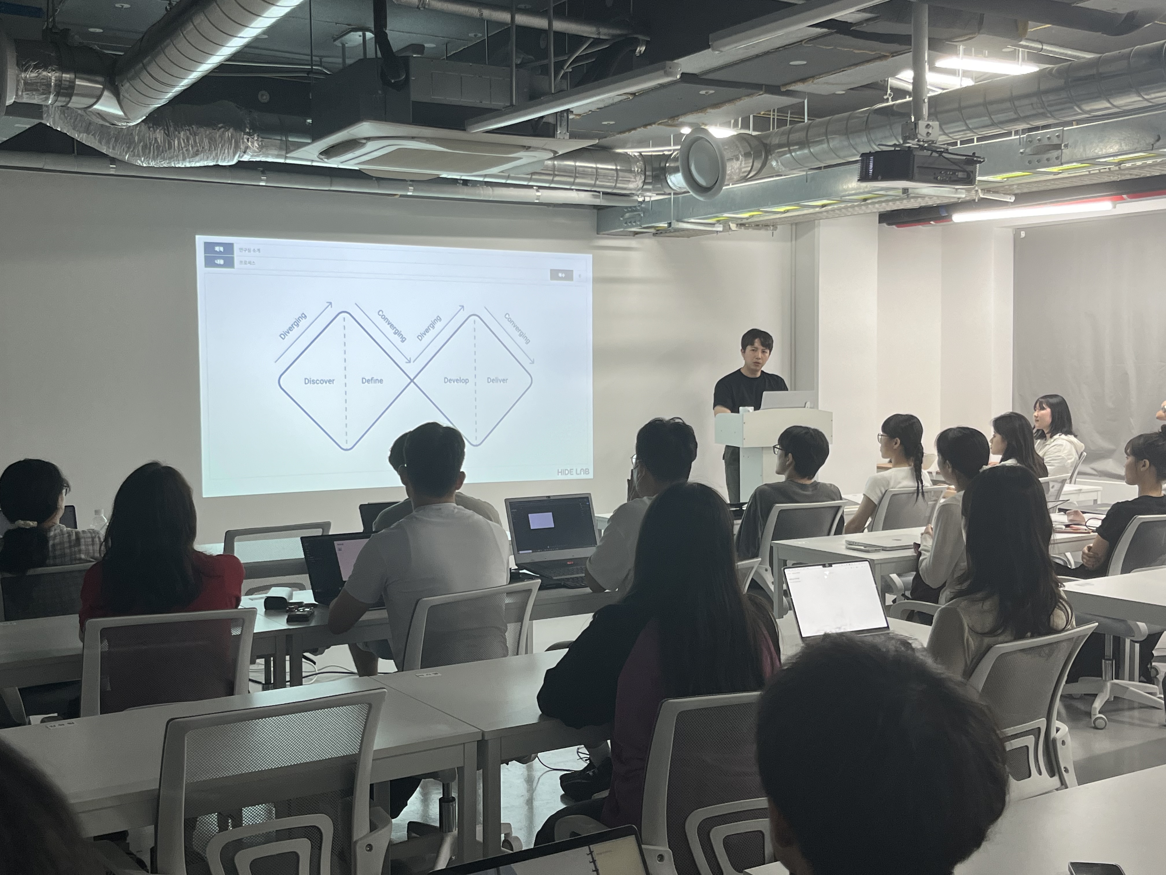 HIDE Lab 9기 학부연구원 킥오프 미팅이 9월 8일 월요일 저녁 7시, 아트앤디자인밸리 110호 산학협력공간에서 열렸습니다. 이번 9기 학부연구원에는 총 29명이 지원하였으며, 선발된 연구원들이 한자리에 모여 연구실 활동의 본격적인 출발을 알렸습니다. 이번 미팅은 연구실의 비전과 앞으로의 방향성을 공유하는 것으로 시작되었으며, HIDE Lab이 추구하는 연구 철학과 지향점을 직접 체감할 수 있는 시간이 되었습니다. 연구실은 디자인의 창의성과 공학의 논리성을 융합하여 새로운 사용자 가치를 창출하는 것을 목표로 하고 있으며, 이에 따라 학부연구원들의 역할과 기대되는 성과를 구체적으로 안내하였습니다.
