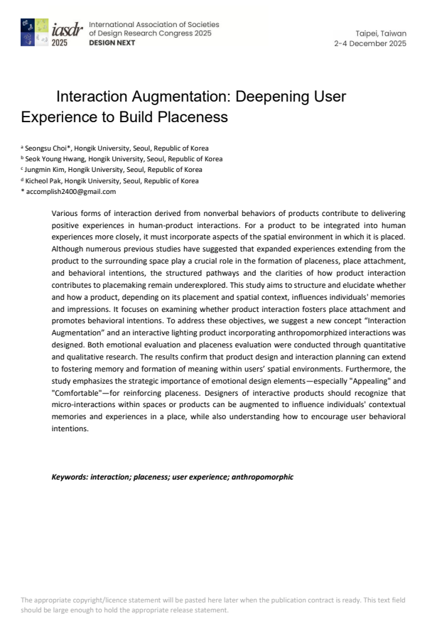 본 연구는 제품의 상호작용이 단순한 사용 경험을 넘어 공간적 맥락과 연결되며, 사용자가 특정 장소에 대한 기억과 정서적 애착을 형성하는 데 어떤 영향을 미치는지 규명하는 것을 목적으로 한다. 기존 연구들은 사람과 장소의 관계, 즉 ‘플레이스니스(placeness)’와 장소애착이 인간의 행동 의도와 밀접하게 관련됨을 강조해왔다. 그러나 제품 상호작용이 어떻게 장소 경험으로 확장되는지에 대한 구체적 경로는 명확히 규명되지 않았다. 이에 본 연구는 ‘인터랙션 증강(Interaction Augmentation)’이라는 개념을 제시하고, 이를 구현하기 위한 의인화된 상호작용 조명 제품을 설계하였다.