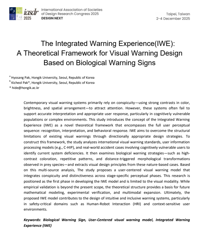 연구는 국제 표준(ISO, ANSI, KS, JIS 등), 인지 처리 모델(C-HIP), 그리고 실제 사고 사례를 분석하여 현재 경고 체계의 구조적 문제점을 도출하였다. 그 결과, 경고가 잘 보이는 것만으로는 충분하지 않고, 사용자가 이를 해석하고 적절히 행동할 수 있도록 돕는 ‘변별성(distinctiveness)’ 개념을 보완해야 함을 강조한다. 또한, 자연계의 경고 표현—예컨대 독개구리의 선명한 체색, 복어의 체적 확장, 문어의 위협적 패턴 노출 등—은 포식자의 본능적 회피 반응을 유도하는 효과적 전략임을 확인하였다. 이를 토대로 연구는 생물학적 원리를 경고 디자인 요소로 추출하여, 색 대비, 명도 대비, 반복적 패턴, 형태 변환, 거리 의존적 신호 등 구체적인 설계 지침을 도출하였다.