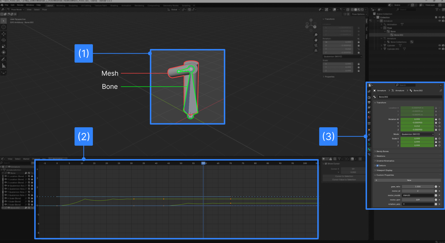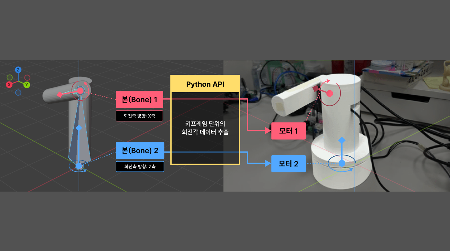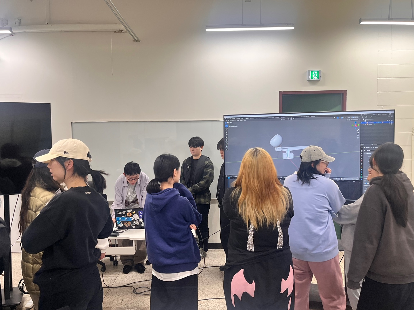 실습 세션에서는 학생들이 직접 키프레임 애니메이션을 제작하고, 움직임의 속도나 곡선(ease-in, ease-out)을 조정해 자연스러운 모션을 설계하는 과정을 경험했습니다. 제작된 애니메이션은 Blender2Motor 시스템을 통해 Dynamixel 모터로 전송되어 실제 로봇 팔 구조가 동일한 움직임을 수행하는 모습으로 재현되었습니다. 학생들은 자신이 디자인한 가상의 움직임이 물리적 세계에서 구현되는 과정을 통해, 디자인과 공학이 긴밀히 연결된 융합적 창작의 가치를 직접 체감했습니다.
