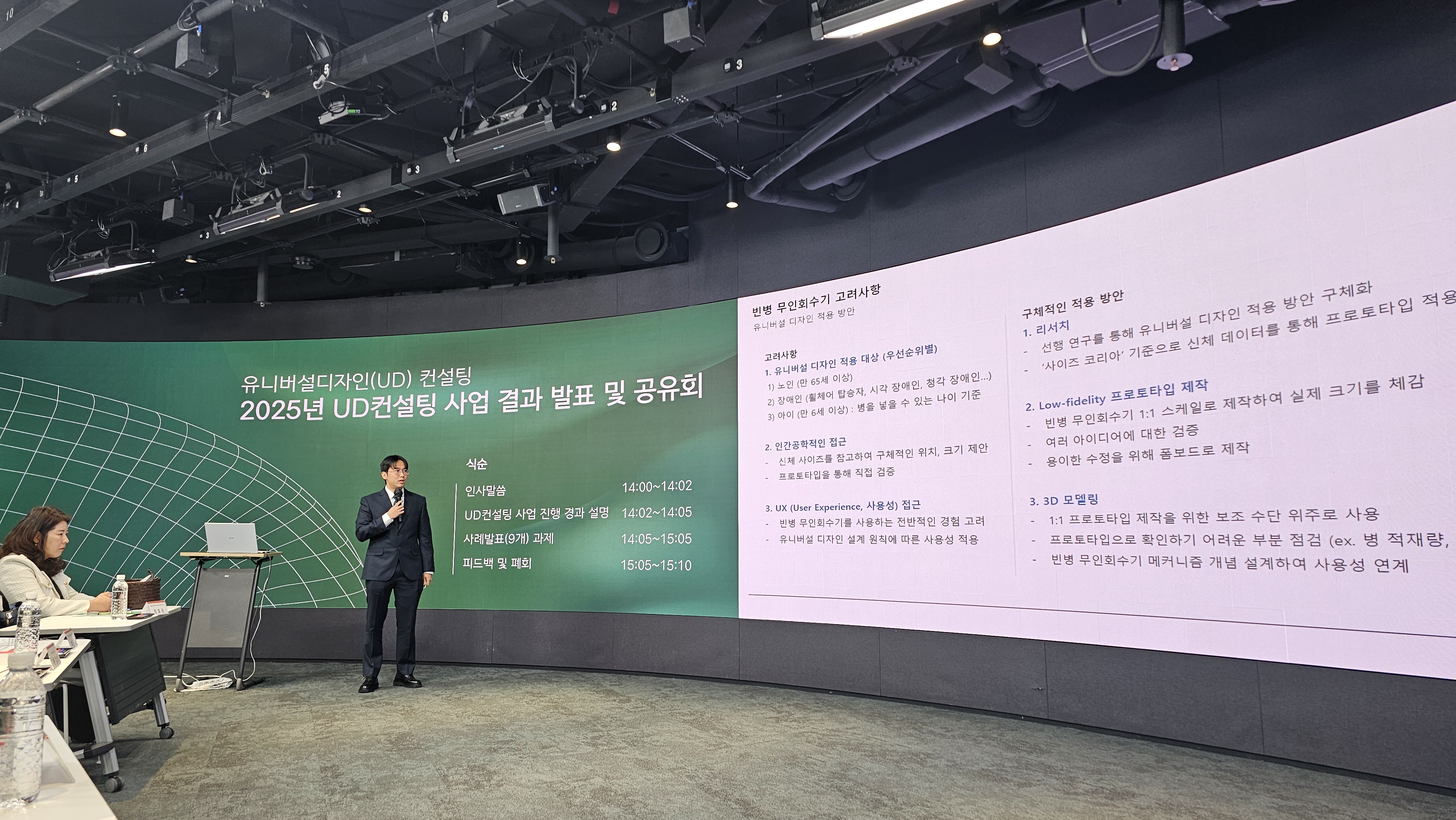 조규형 연구원은 발표에서 공공장소에서 발생할 수 있는 다양한 문제와 사용자 접근성을 함께 고려한 빈병 무인회수기의 설계 과정을 소개하며, 디자인을 통한 환경 문제 해결의 가능성을 제시했습니다. 그는 이번 프로젝트의 핵심이 단순히 자원을 회수하는 기계를 만드는 것이 아니라, 인간 중심의 기술 디자인을 통해 누구나 쉽게 참여할 수 있는 순환경제 생태계를 구축하는 데 있다고 강조했습니다. 이를 위해 연구팀은 편의점, 마트, 공공시설 등 다양한 환경에서 조화롭게 설치될 수 있도록 심미성과 기능성을 동시에 갖춘 형태를 개발했으며, 노약자, 장애인, 아동 등 다양한 사용자의 신체 조건과 행동 패턴을 분석하여 유니버설 디자인 원칙을 적용했습니다.