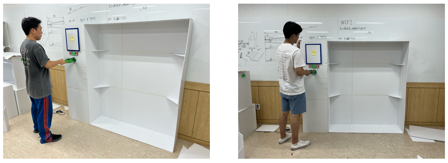 연구 과정에서는 실제 사용자의 접근성과 편의성을 검증하기 위한 1:1 스케일의 Low-fidelity 프로토타입이 제작되었습니다. 팀은 ‘사이즈 코리아(Size Korea)’의 인체치수 데이터를 기반으로 디스플레이 위치, 손 닿는 높이, 병 투입구의 각도 등을 세밀하게 조정하고, 휠체어 사용자와 시니어 사용자를 대상으로 테스트를 진행했습니다. 이를 통해 누구나 자연스럽게 기기를 사용할 수 있는 인터페이스와 물리적 구조를 완성하였으며, 특히 손의 위치, 화면 가독성, 접근 각도 등 세부적인 인간공학적 데이터를 반영하여 완성도를 높였습니다.