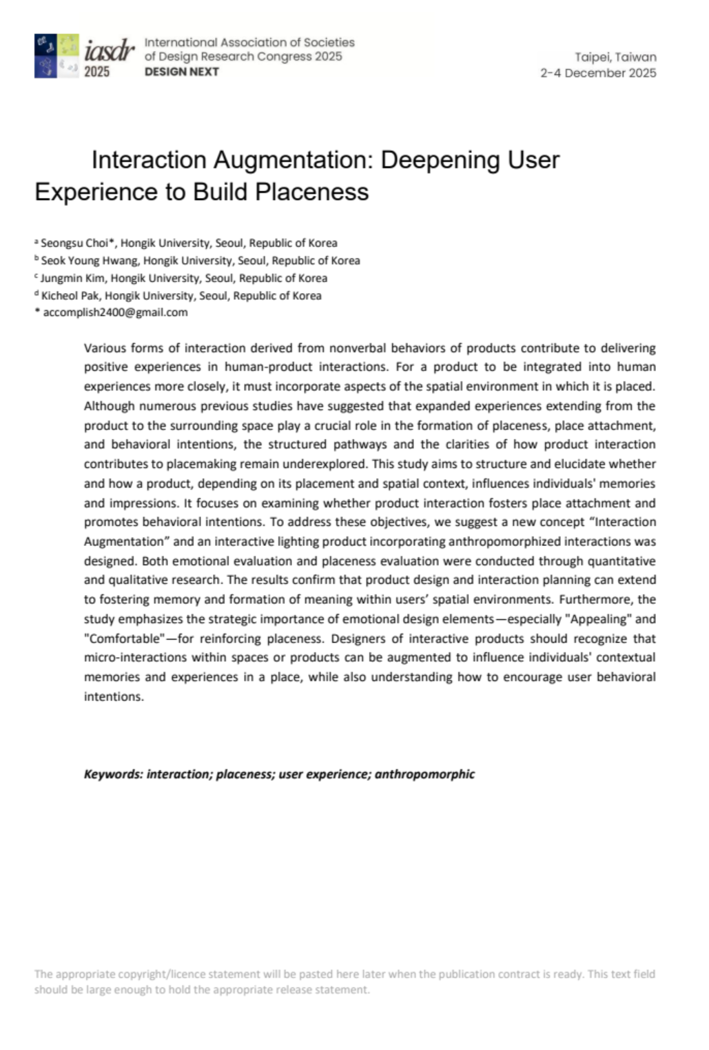 [DRS Digital Library] Choi, S., Hwang, S. Y., Kim, J., & Pak, K. (2025). Interaction Augmentation: Deepening User Experience to Build Placeness. In Proceedings of IASDR 2025: Design Next, Taipei, Taiwan. To be published in the IASDR 2025 Online Proceedings and archived in the DRS Digital Library.