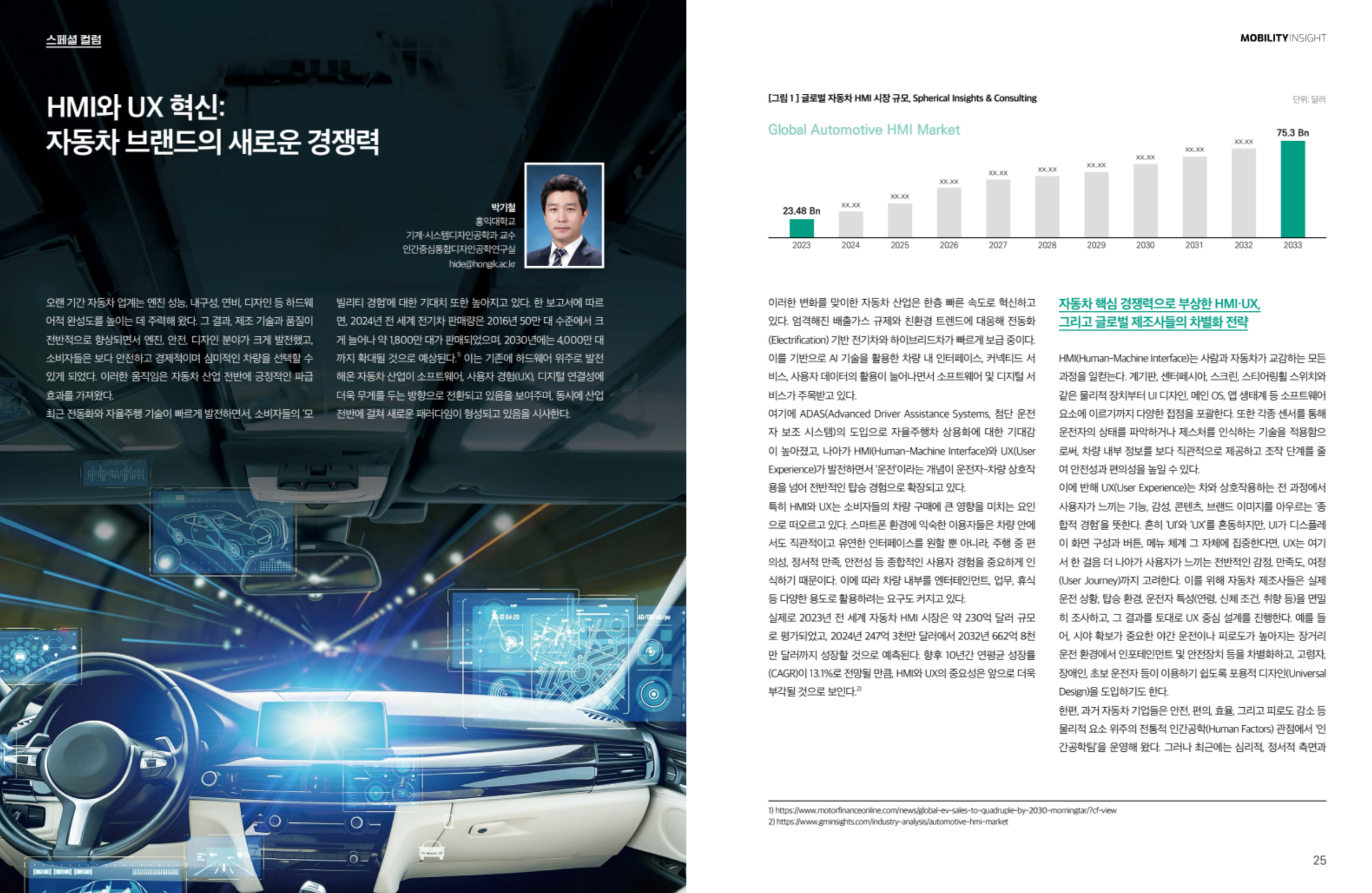 HMI와 UX는 더 이상 보조적 요소가 아니라 자동차 브랜드의 정체성과 경쟁력을 결정짓는 핵심 분야입니다. 우리 연구실이 지속적으로 탐구하는 인간 중심 통합 디자인, 사용자 경험, 인터페이스 혁신과 같은 주제들은 앞으로의 모빌리티 패러다임 변화와 긴밀히 연결되어 있으며, 이는 학술적으로나 산업적으로 큰 의미를 갖습니다. 앞으로도 연구실은 학문적 연구와 산업 현장의 협력을 통해 자동차 HMI와 UX 혁신을 선도하고, 미래 모빌리티 시대를 준비하는 데 기여하고자 합니다.