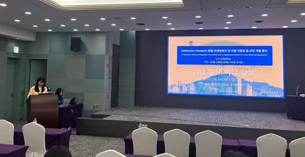 저의 발표는 홈 로봇의 지속적 수용을 위해 기능적 효용과 정서적 즐거움을 통합적으로 고려하는 U&H 설계 툴킷 제안을 주제로 진행되었습니다. 본 연구는 로봇이 실질적 도움(Utilitarian)과 감성적 만족(Hedonic) 중 어느 한 축이라도 부족할 경우 장기 사용으로 이어지기 어렵다는 문제의식에서 출발하였습니다. 이를 해결하기 위해 두 가치의 개념을 체계화하고, 초기 기획 단계에서 디자이너와 엔지니어가 이를 시각적으로 검토할 수 있는 실용적 도구를 개발하는 데 초점을 두었습니다.