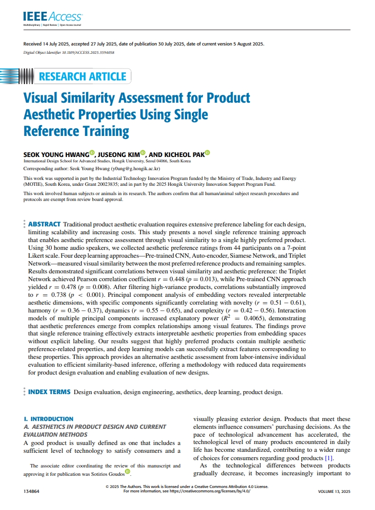 결론적으로 본 연구는 단일 참조 학습을 기반으로 한 새로운 심미적 평가 방법이 기존의 데이터 라벨링 중심 방식보다 훨씬 적은 데이터로도 해석 가능한 결과를 제공할 수 있음을 보여주었다. 이는 디자인 엔지니어링 실무에서 비용과 시간을 절감하면서도, 새로운 제품 디자인의 심미성을 효율적으로 평가할 수 있는 가능성을 열어준다. 다만 연구는 소규모 참가자와 특정 제품군(홈 오디오 스피커)에 한정되어 있어 일반화 가능성에 한계가 있으며, 참조 제품 선택의 편향이 결과에 영향을 줄 수 있다는 점도 한계로 지적된다. 그럼에도 불구하고 이 방법론은 향후 다양한 제품군에 적용되어 데이터 기반 디자인 평가의 새로운 가능성을 열 수 있는 유망한 접근으로 평가된다.