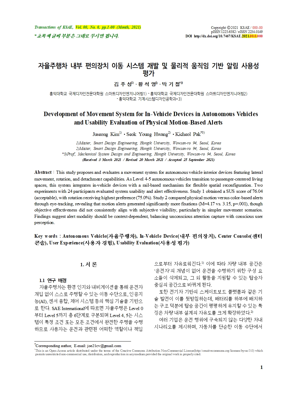 This study aims to propose a movable in-vehicle convenience device system for Level 4–5 autonomous driving contexts—where the cabin shifts from a “driving-centered” space to an “occupant-centered living space”—and to empirically evaluate both its overall usability and the effectiveness of using physical motion itself as an alert modality. Building on a previously developed console-type device and a rail-based bracket mechanism, the authors integrated these elements into a unified system in which the device can translate laterally and rotate in place while inside the vehicle, and can also be detached via vertical lifting from the rail structure so that it can be used outside the vehicle as an independent product. By enabling occupants to reconfigure the space while engaging in non-driving activities such as working, resting, dining, and entertainment, the system embodies the concept of “experience continuity,” extending convenience benefits formed in the vehicle to the destination environment through physical portability and re-deployability.